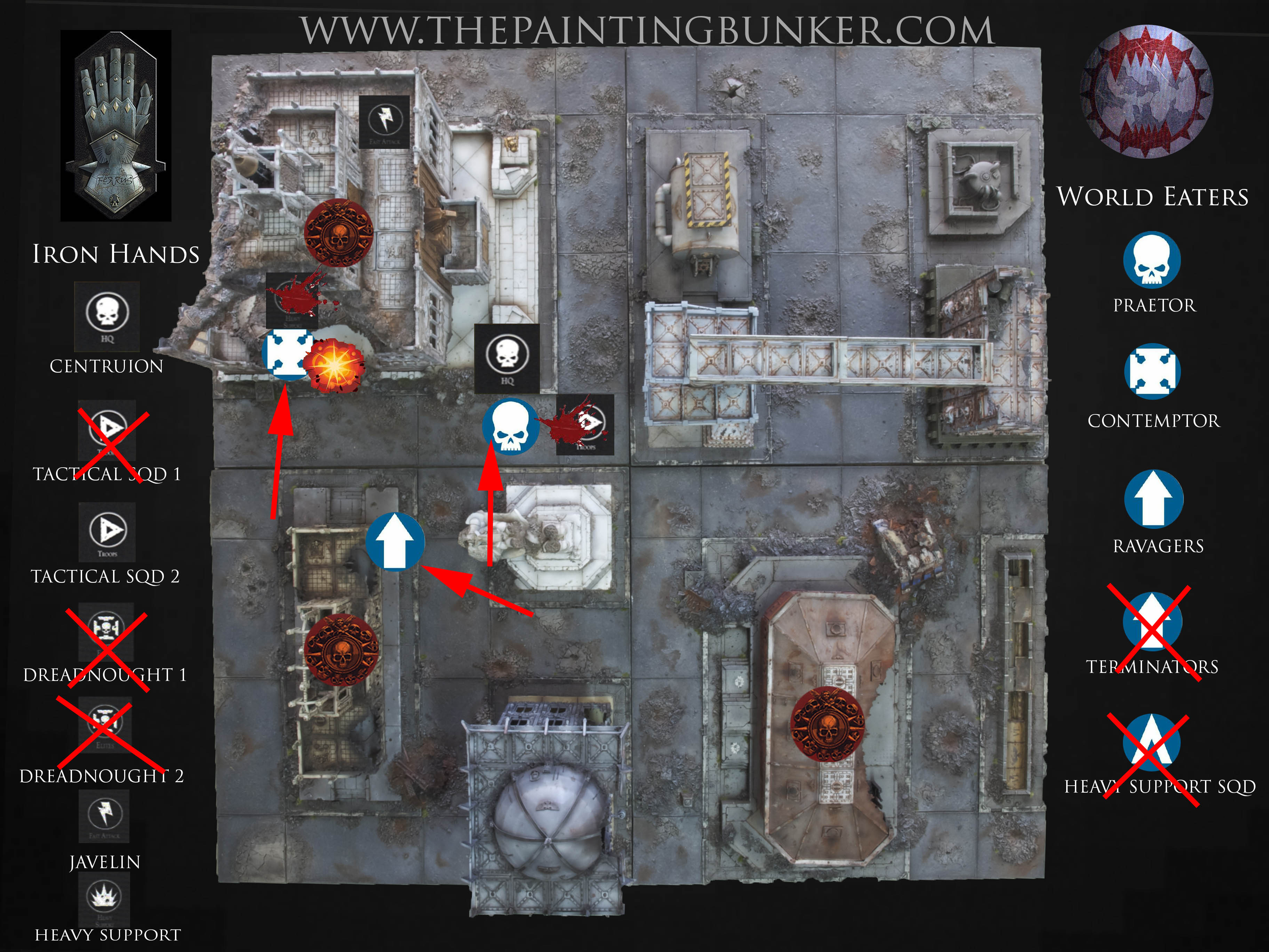 Now seeing the exact trajectory of the enemy Contemptors maneouve, the ancient Iron Hands Dreadnought moves up to the intersect his route. He wants to see close up the effect of his multi melta on the berserk World Eater Contemptor. Seeing the crazed Rampagers, lead by their fearsome Praetor, Tactical Squad 1 plant their feet into the ground, preparing to unleash a fury of disciplined bolter fire on their foe before they can close the gap between them.