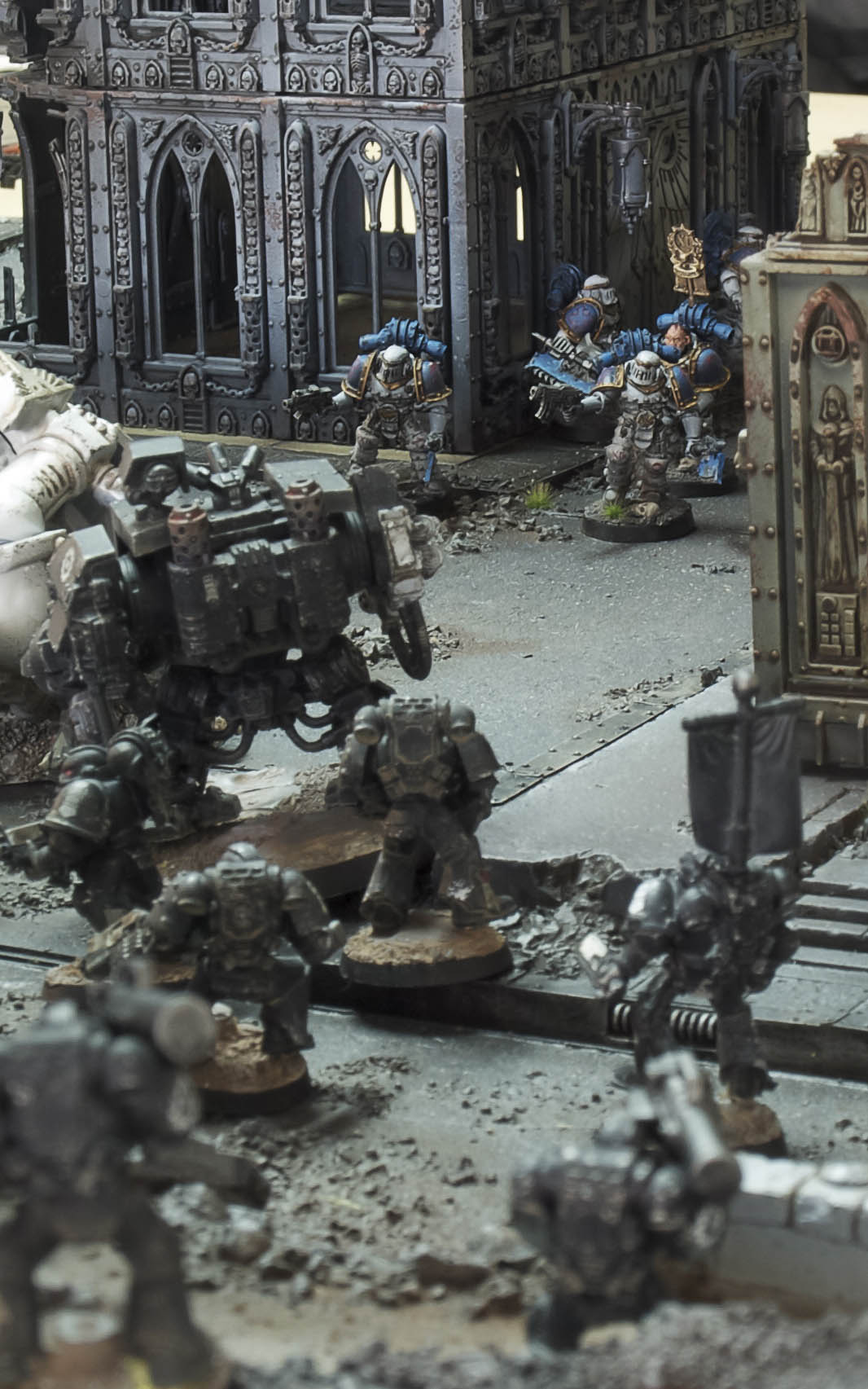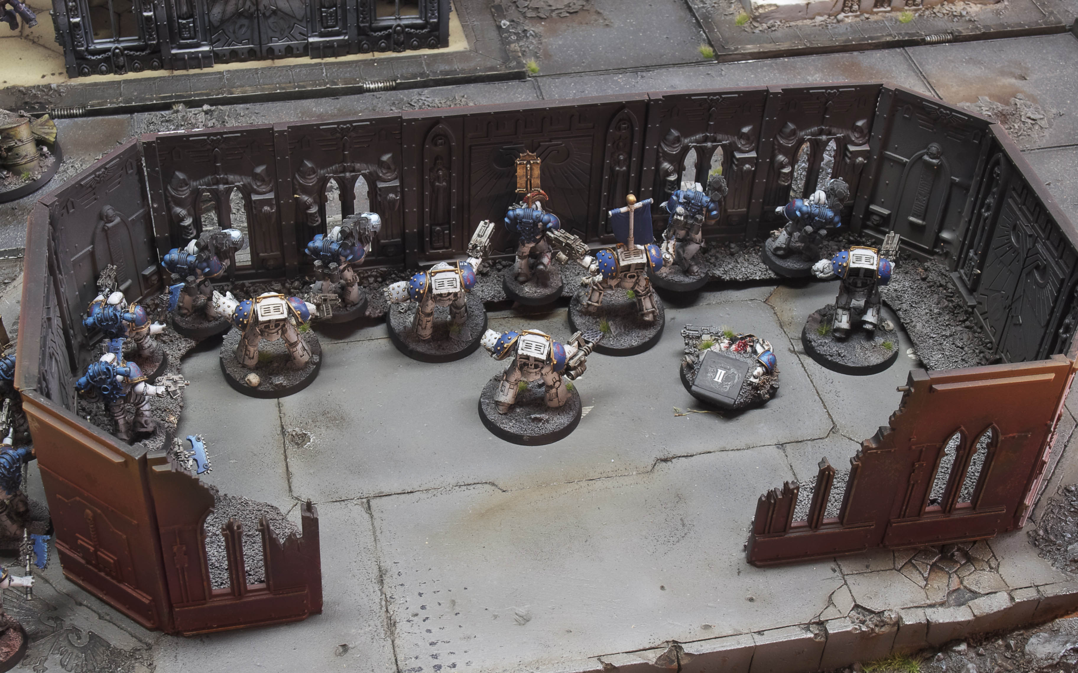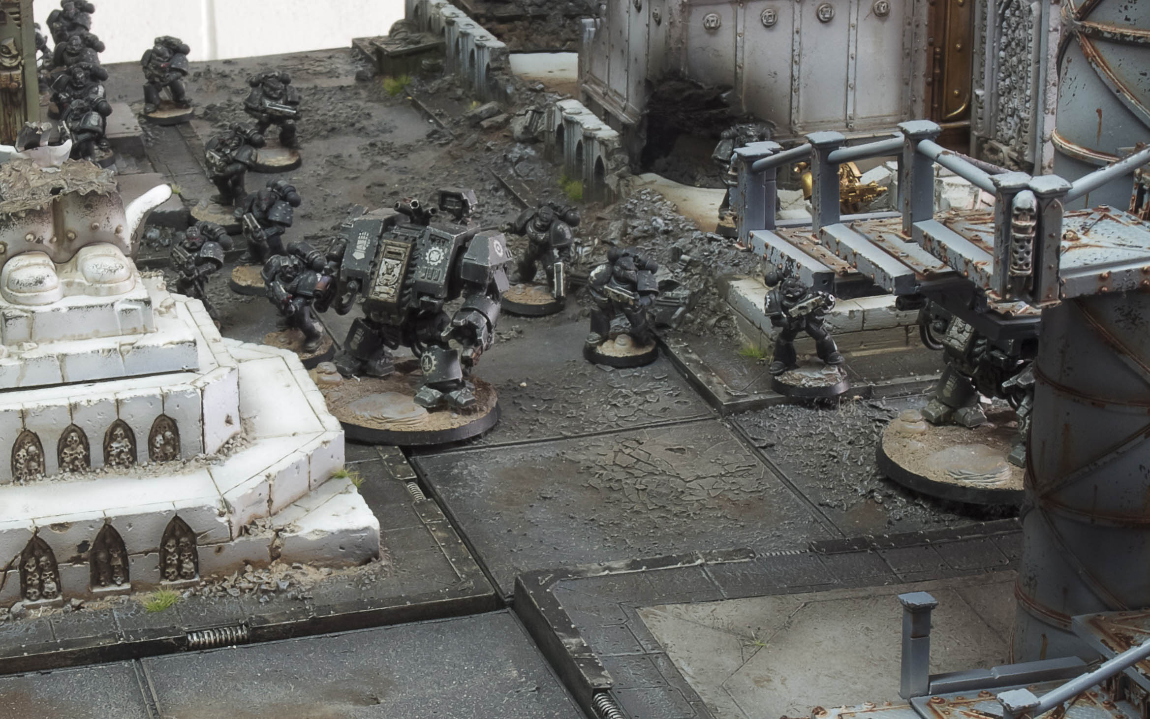 Tactical Squad 2 see the hulking Terminators stepping out of the building and advancing towards them. Not to let the challenge go unheeded, they too brace themselves and prepare to rain unrelenting bolter fire on the traitor filth. To support his brothers, the Second Dreadnought moves to outflank the traitor Terminator Astartes, knowing that they’ll be able to take some punishment before being brought down.