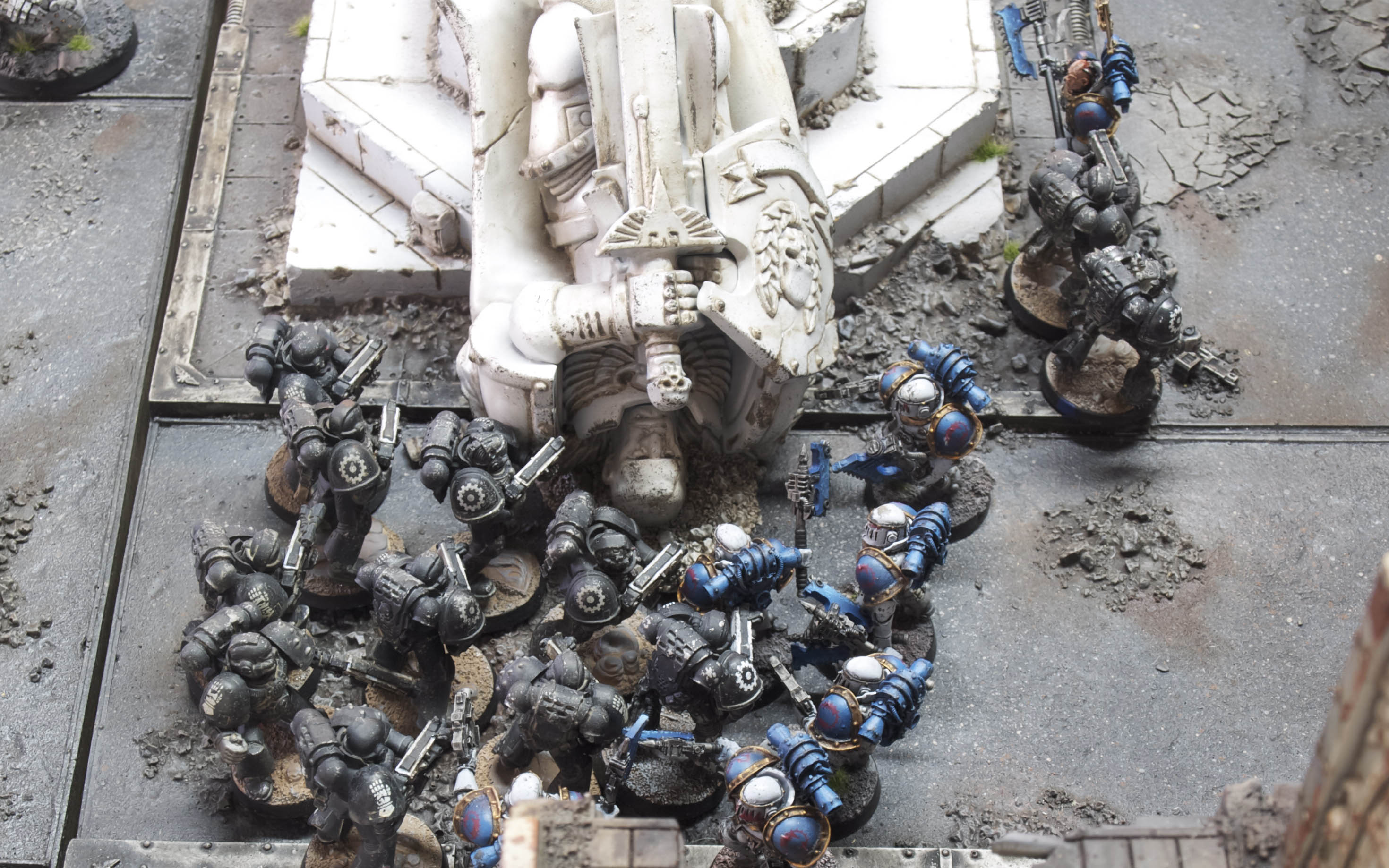 Over at the objective the Terminators stepped out of the building and were greeted with massed bolter fire from the Iron Hands. It was like stepping out into a blizzard. However the tactical dreadnought armour weathered the storm, protecting its occupants. The outflanking Dreadnought took aim with his multi melta at what appeared to be the Terminator squads leader. The super heated air dissolved the armour protecting the warrior inside, causing his flesh to bubble, boil and then liquify.