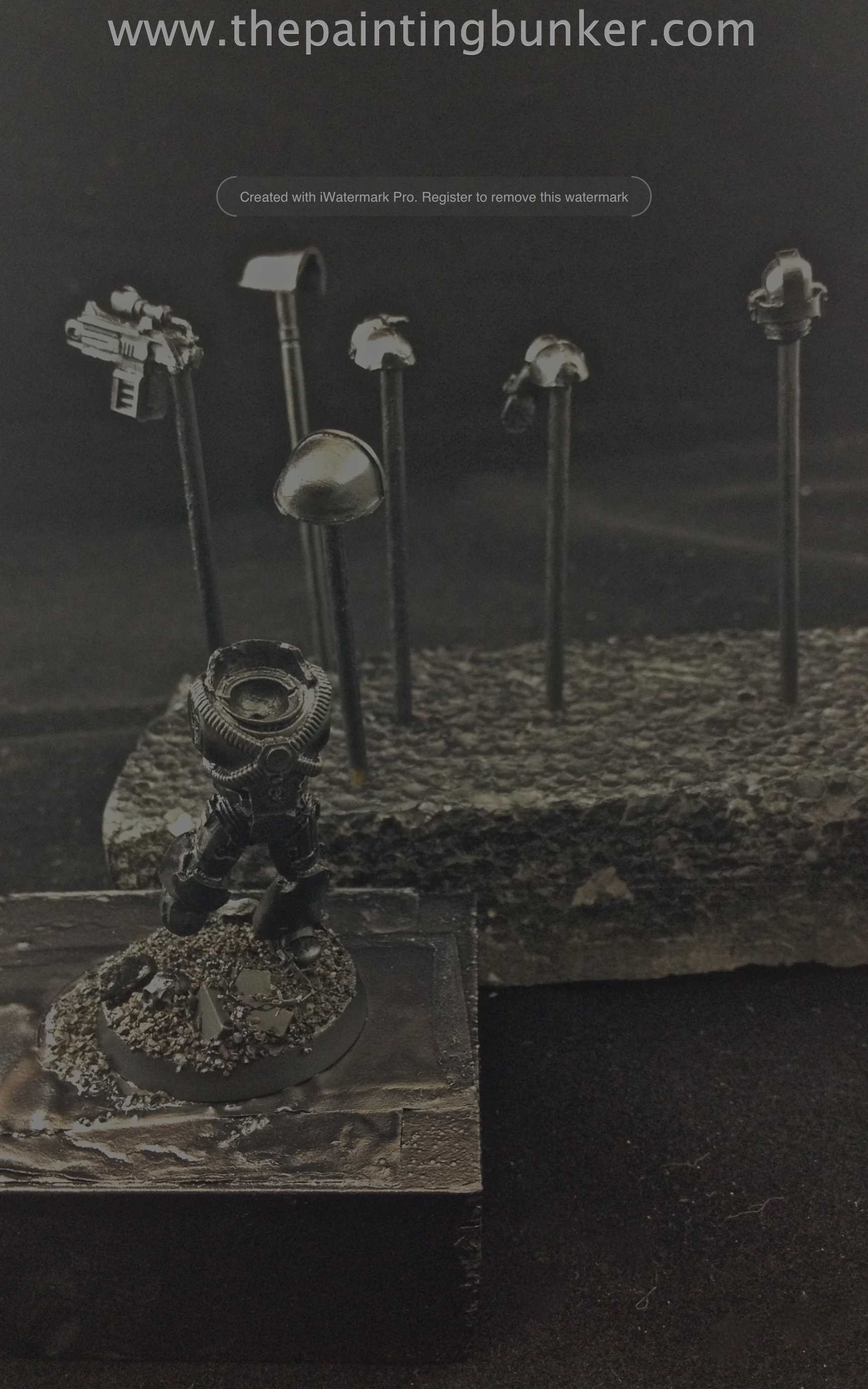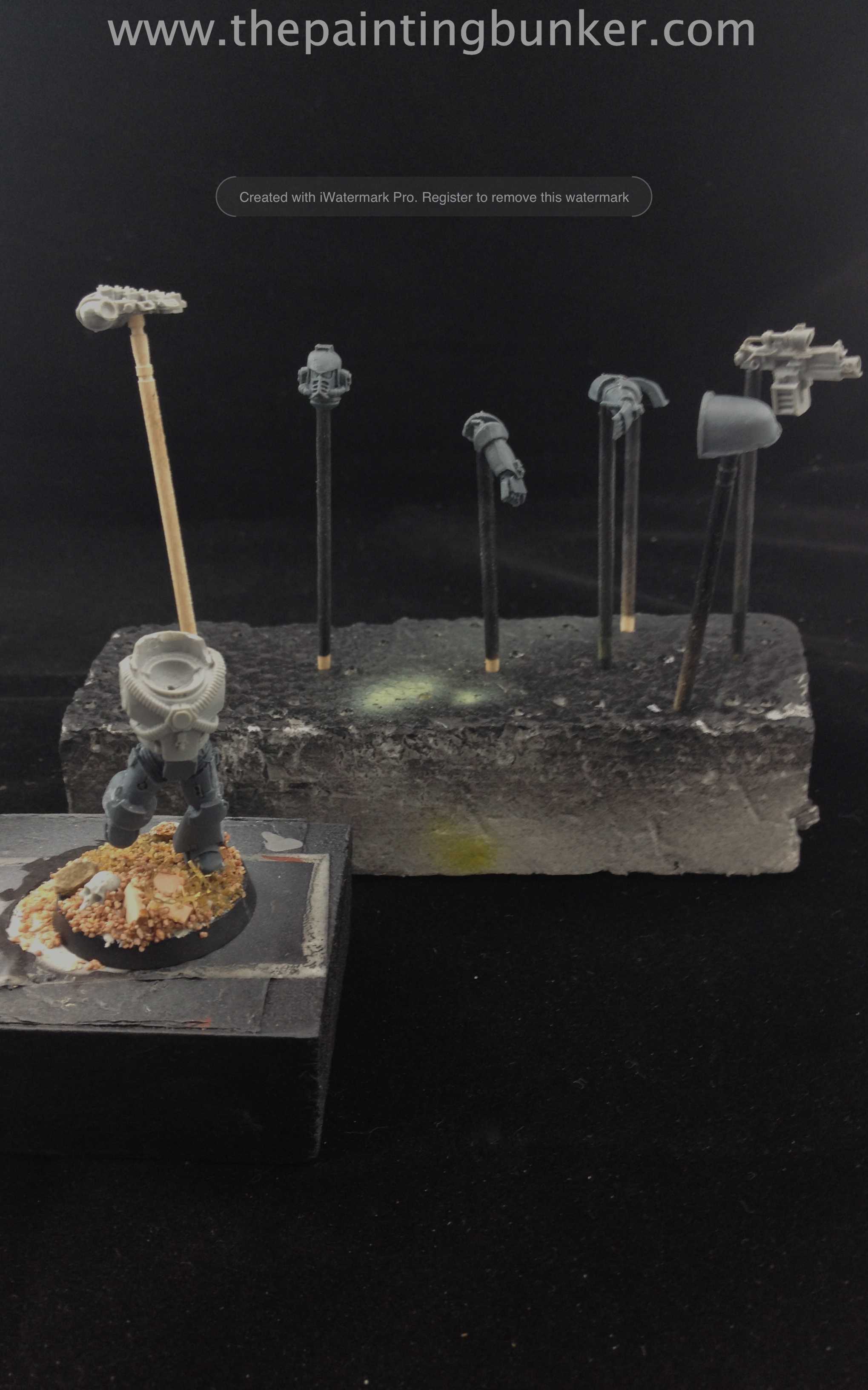 Ideally this should be a permanent place where you can paint. Why? Well Airbrushing is a very equipment intensive aspect to our hobby and all the items you need to use take up space. A small table will do the job, and it needs to have good natural or artificial light with a window close by. A very important feature of any quality Airbrush set up is a spray booth. The two main reasons why you should have a spray booth is to stop overspray going everywhere, and to assist in removing airborne paint particles from the immediate vicinity of the subject (the thing you are painting) The one I use has an extraction fan with a flexible hose that I have ducted out a window. It also has a series of filters that prevent paint particles clogging up the extraction fan. It also has a small turntable which allows me to put my subject on and move it about without having to touch it. As you can see from the picture, my area isn’t big and doesn’t take up a lot of room, and nor should it, but it is functional. I’ve got my spray booth, an area above it to keep useful items, a turn table and a clear space off to one side to set my subject down before and after its been painted.